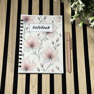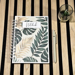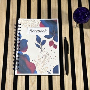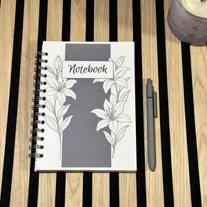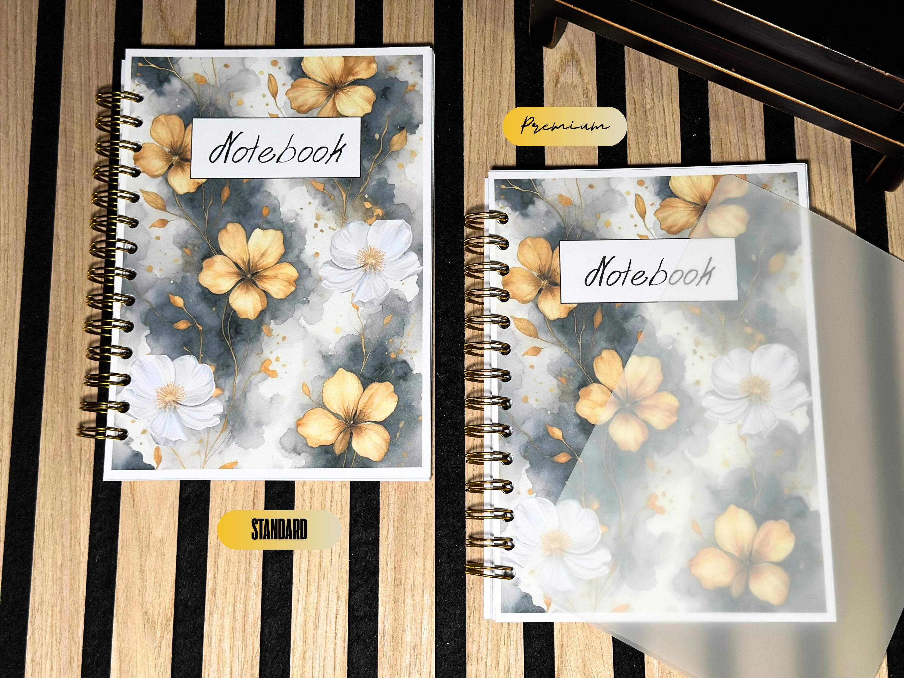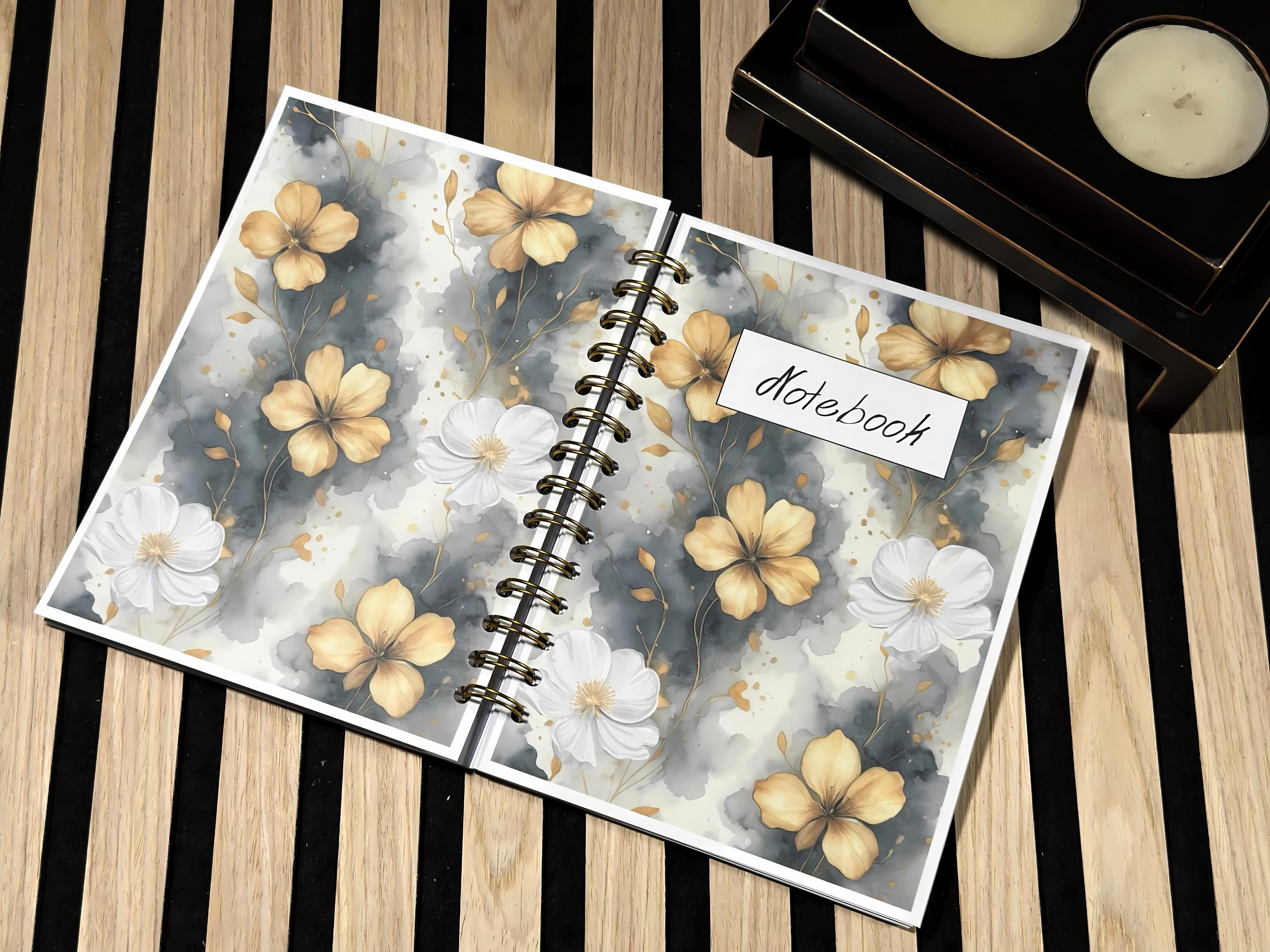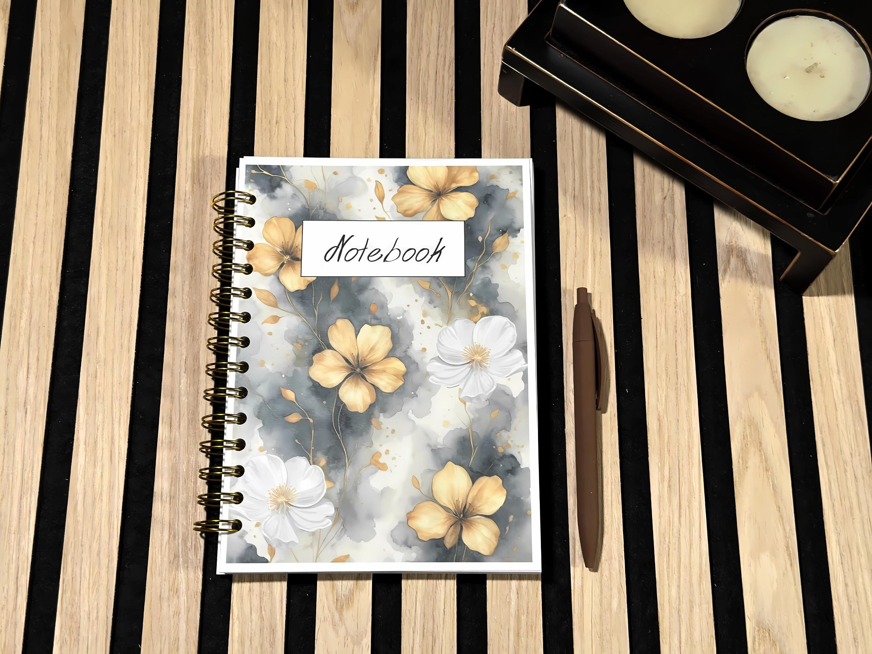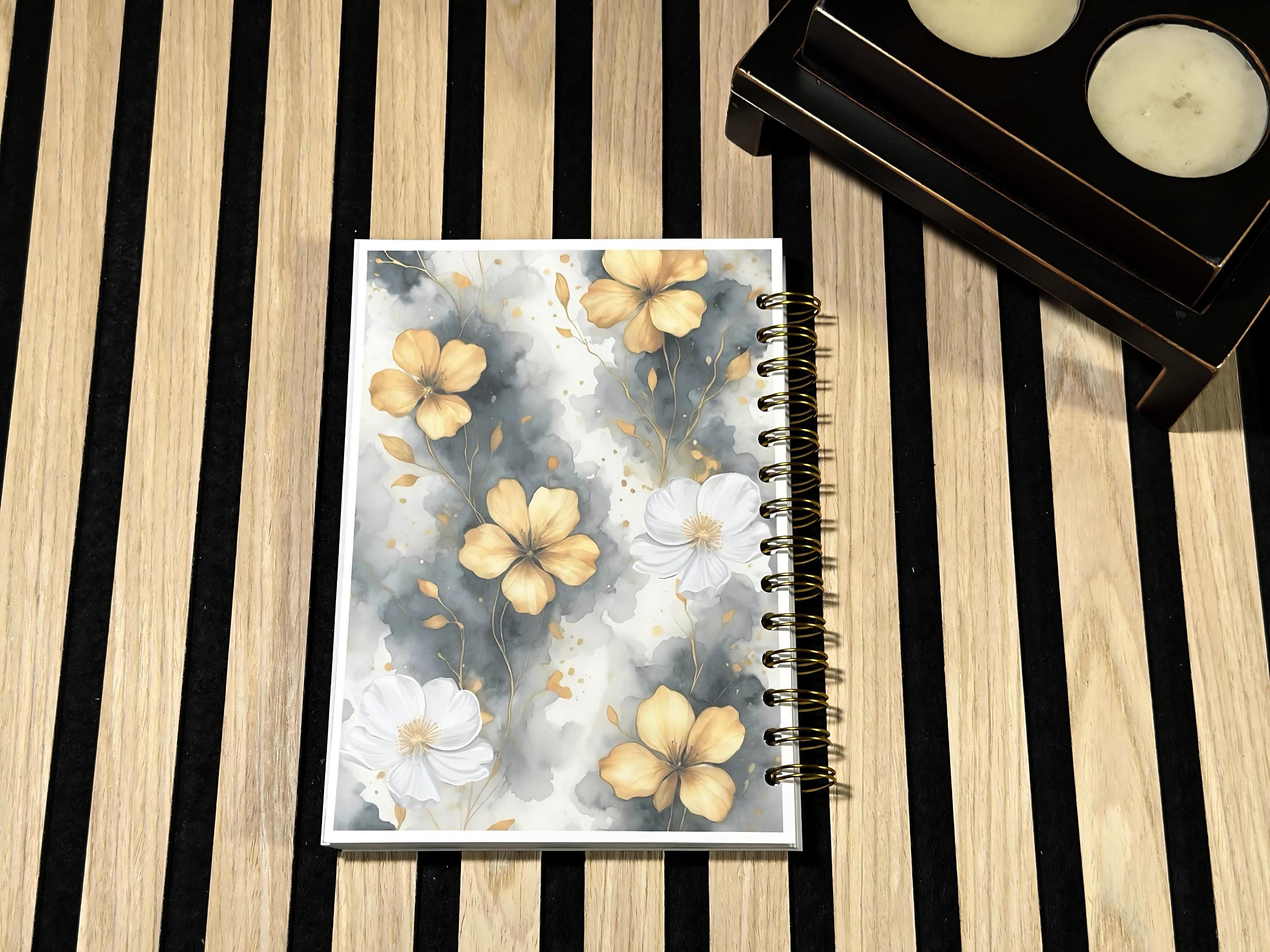 An elegant notebook with golden flowers on a gray watercolor background, perfect for notes, study, and everyday journaling. The gold metal spiral opens flat so you can write comfortably right to the last page.