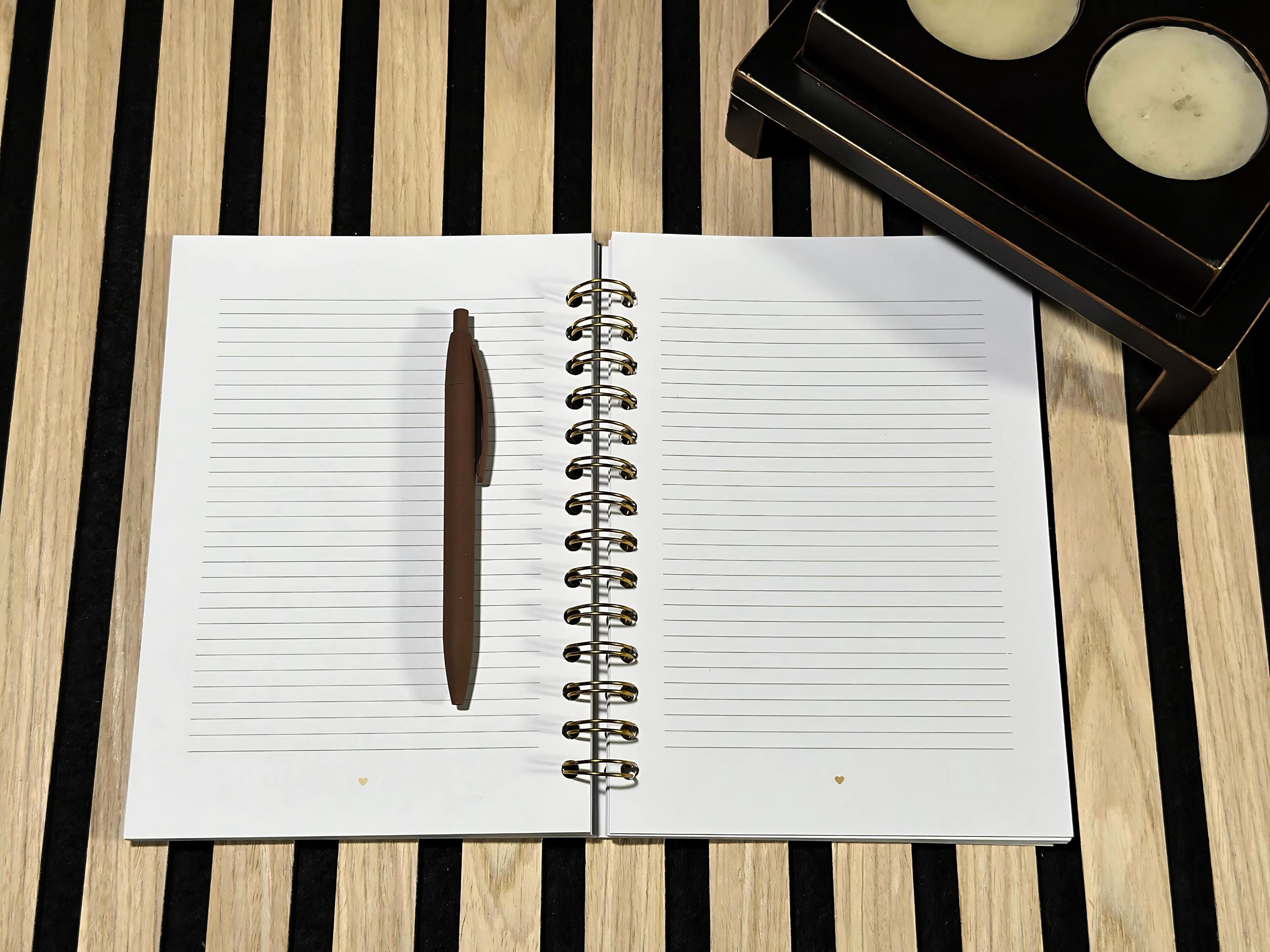 🌼 Sophisticated design with golden accents 📖 Stable on your desk yet lightweight to carry ✨ Premium option with a silky, extra-protected cover ✍️ Ideal for ideas, lists, creative work, and a personal diary