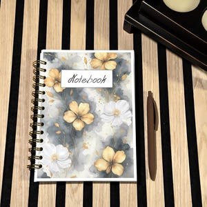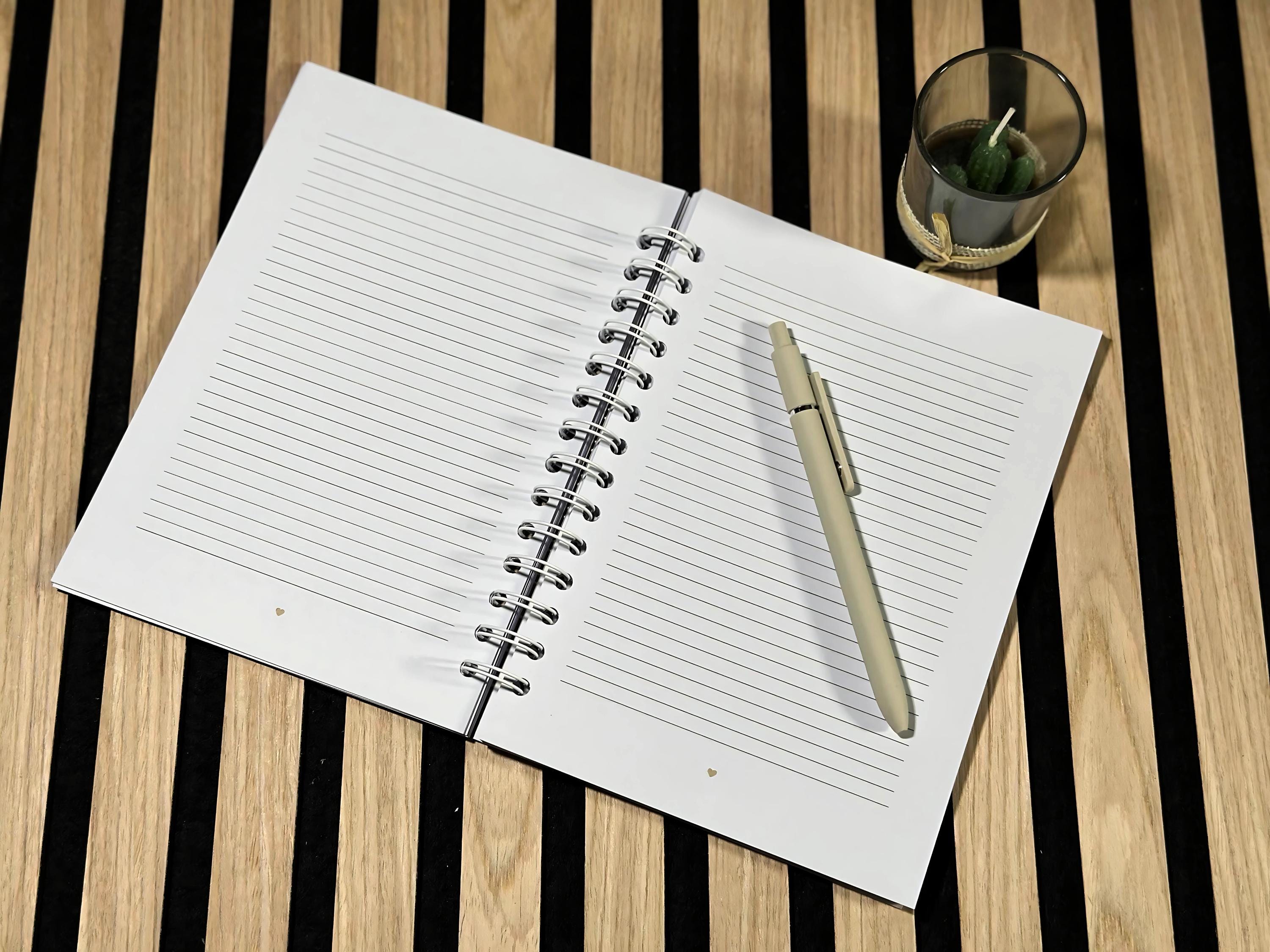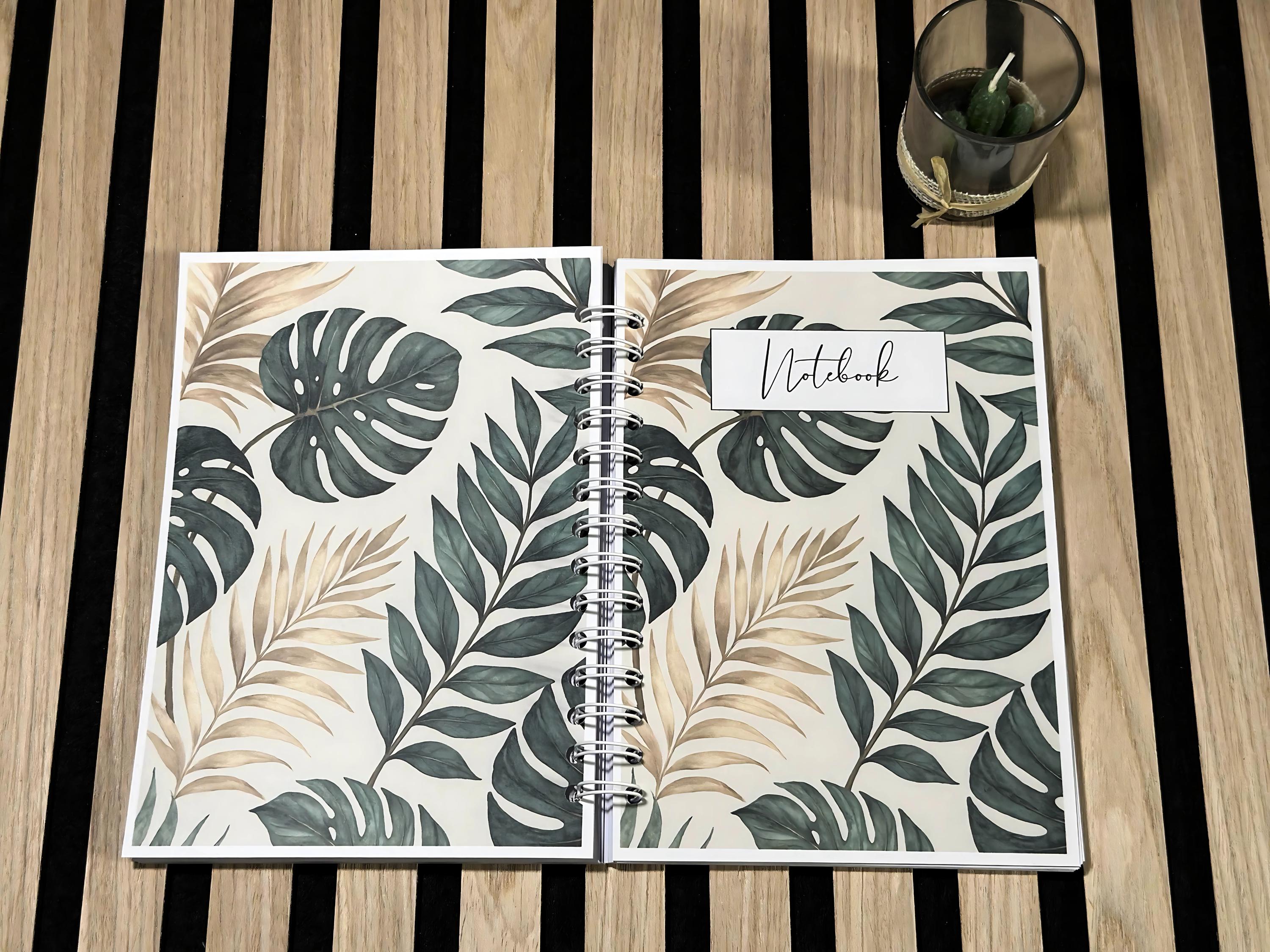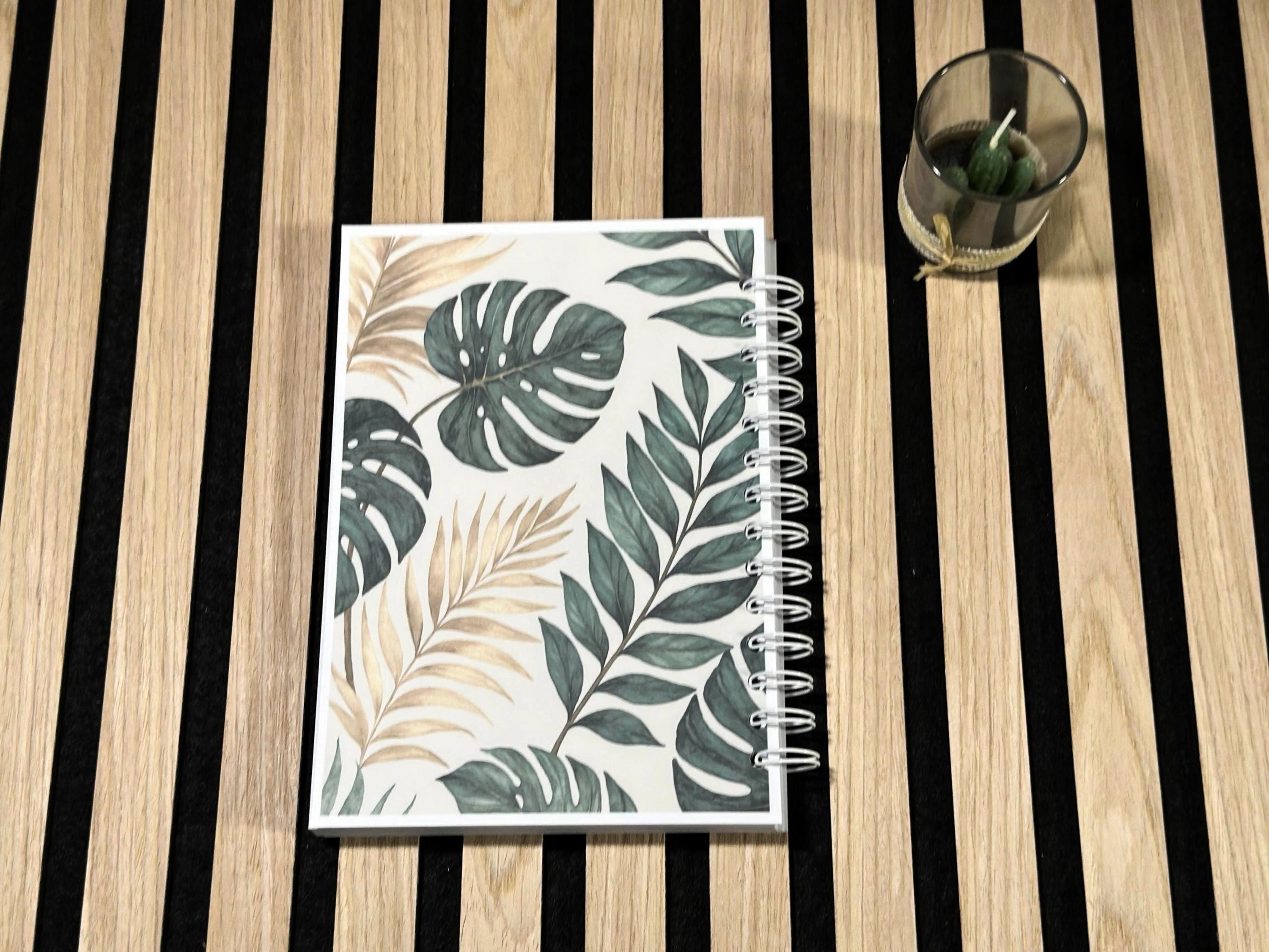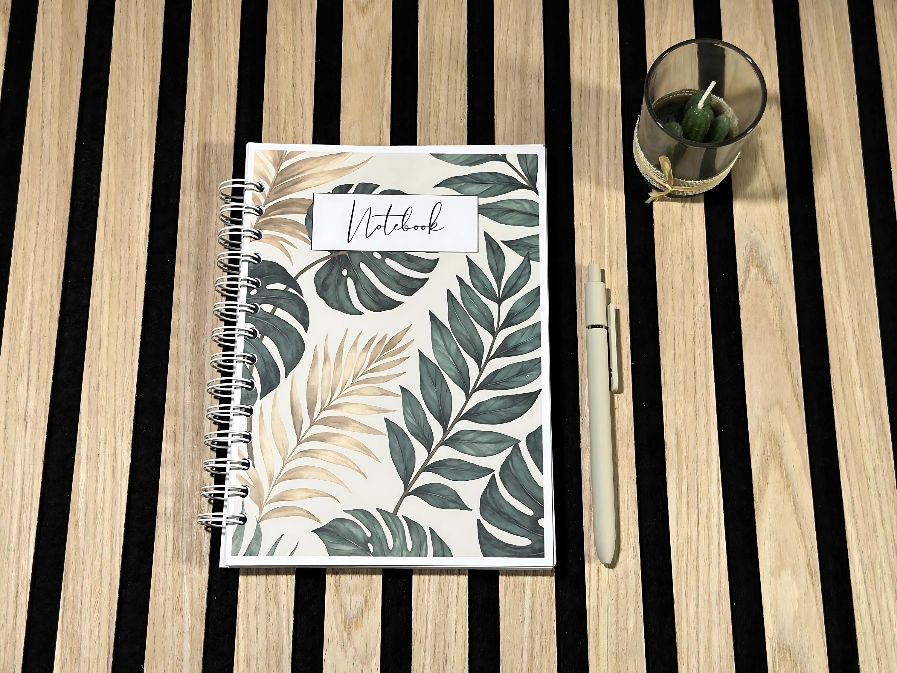 A botanical-inspired notebook with sage-green leaves and natural accents, perfect for notes, lists, and everyday journaling. The white metal spiral lets it lay completely flat for comfortable writing all the way to the last page.