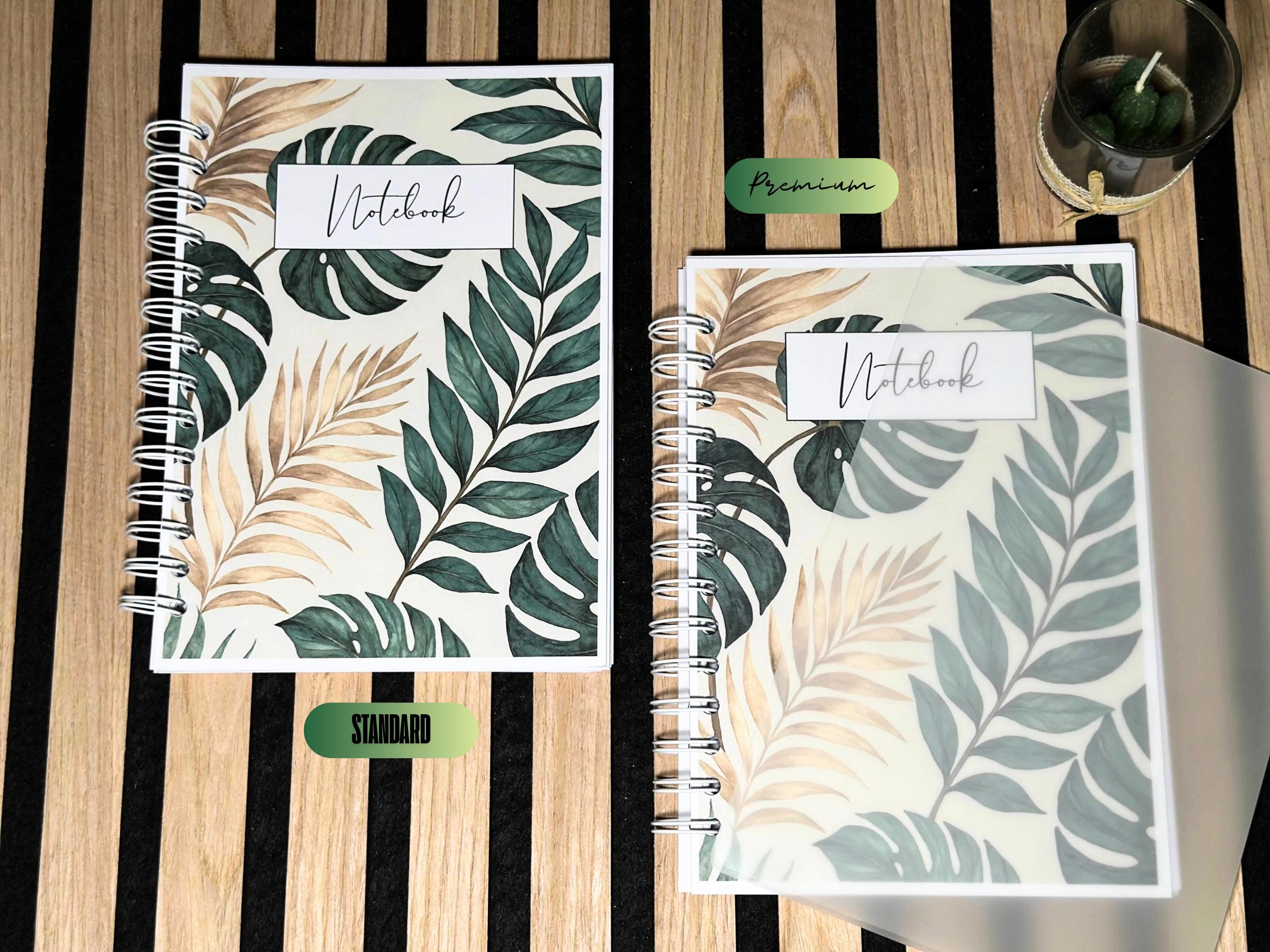 Standard → 300 gsm cardstock cover: light and durable for daily use. Premium → 300 gsm cardstock with hand-applied matte soft-touch laminate: velvety feel, elegant, and better protected from scratches and wear.