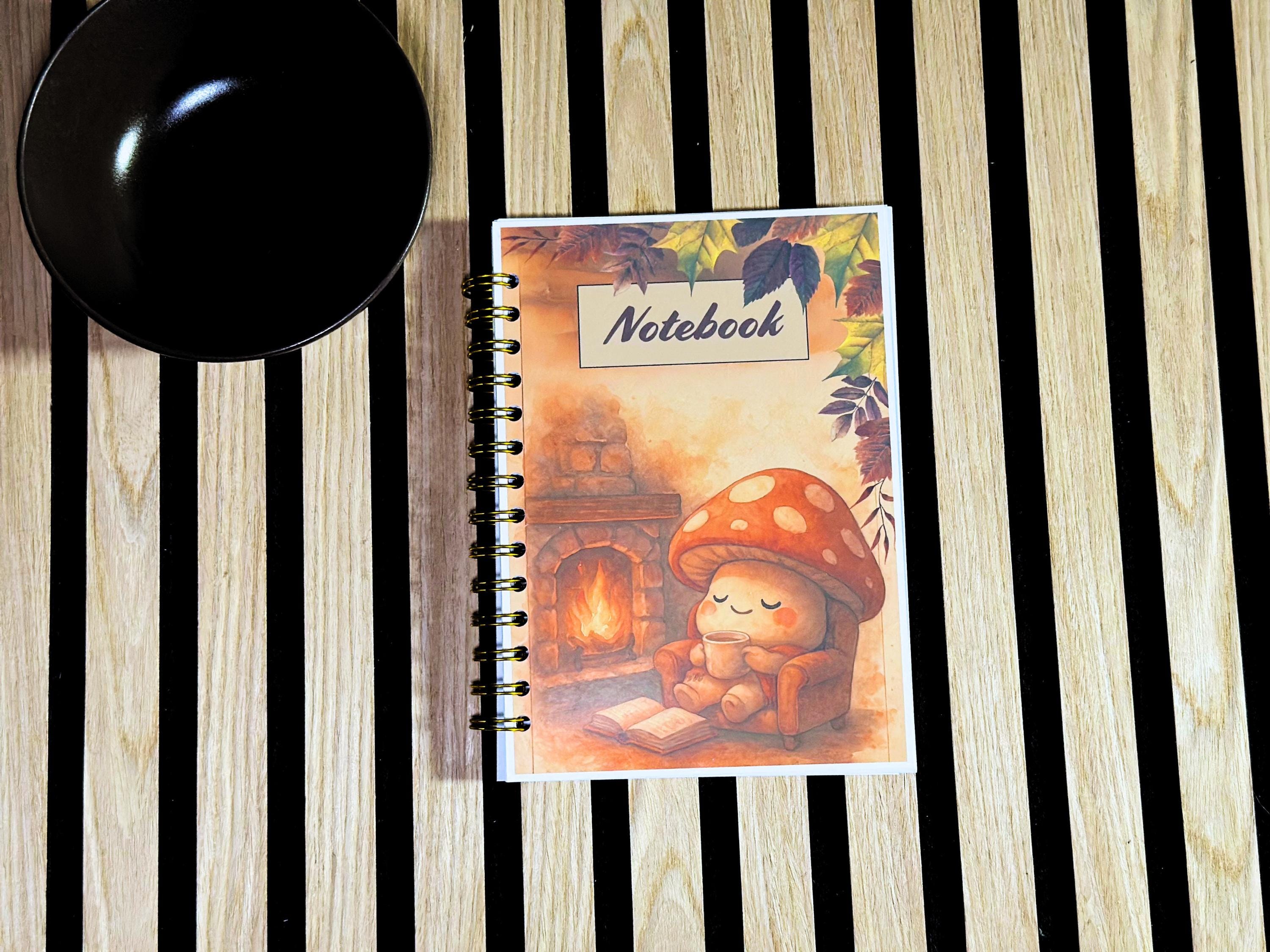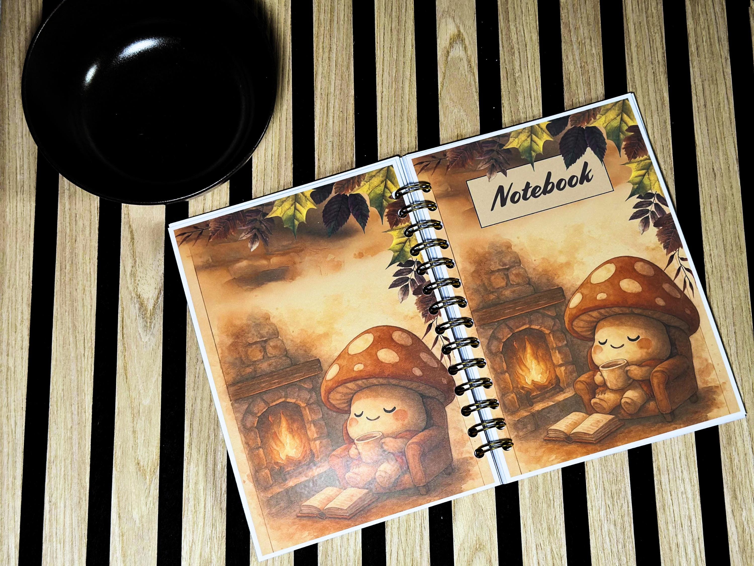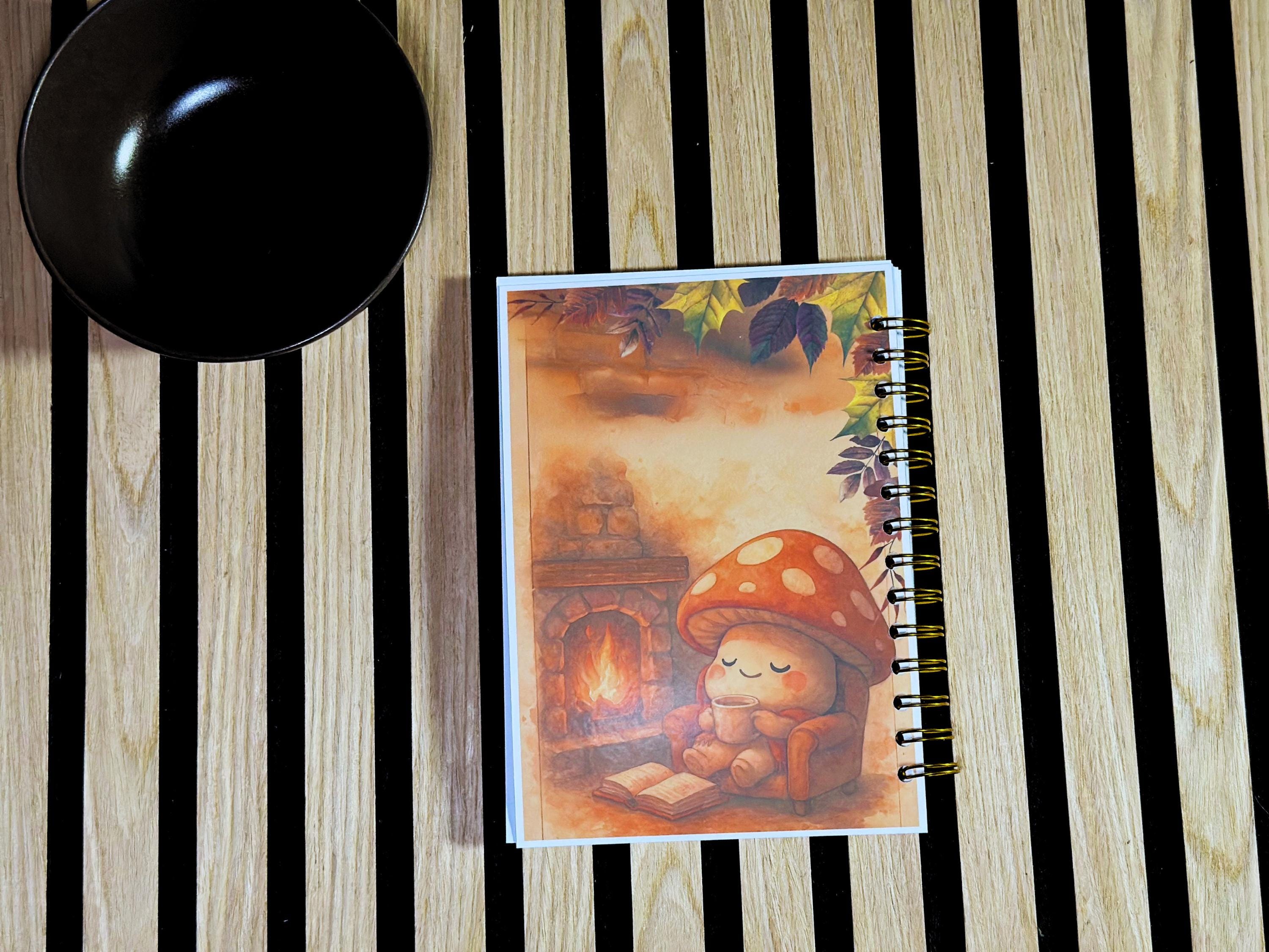 A cozy notebook featuring a cute little mushroom reading by the fireplace, surrounded by autumn leaves and warm tones. The gold metal spiral allows a 360° lay-flat opening, so you can write comfortably all the way to the last page.