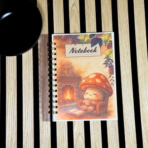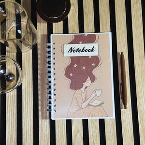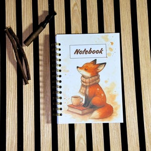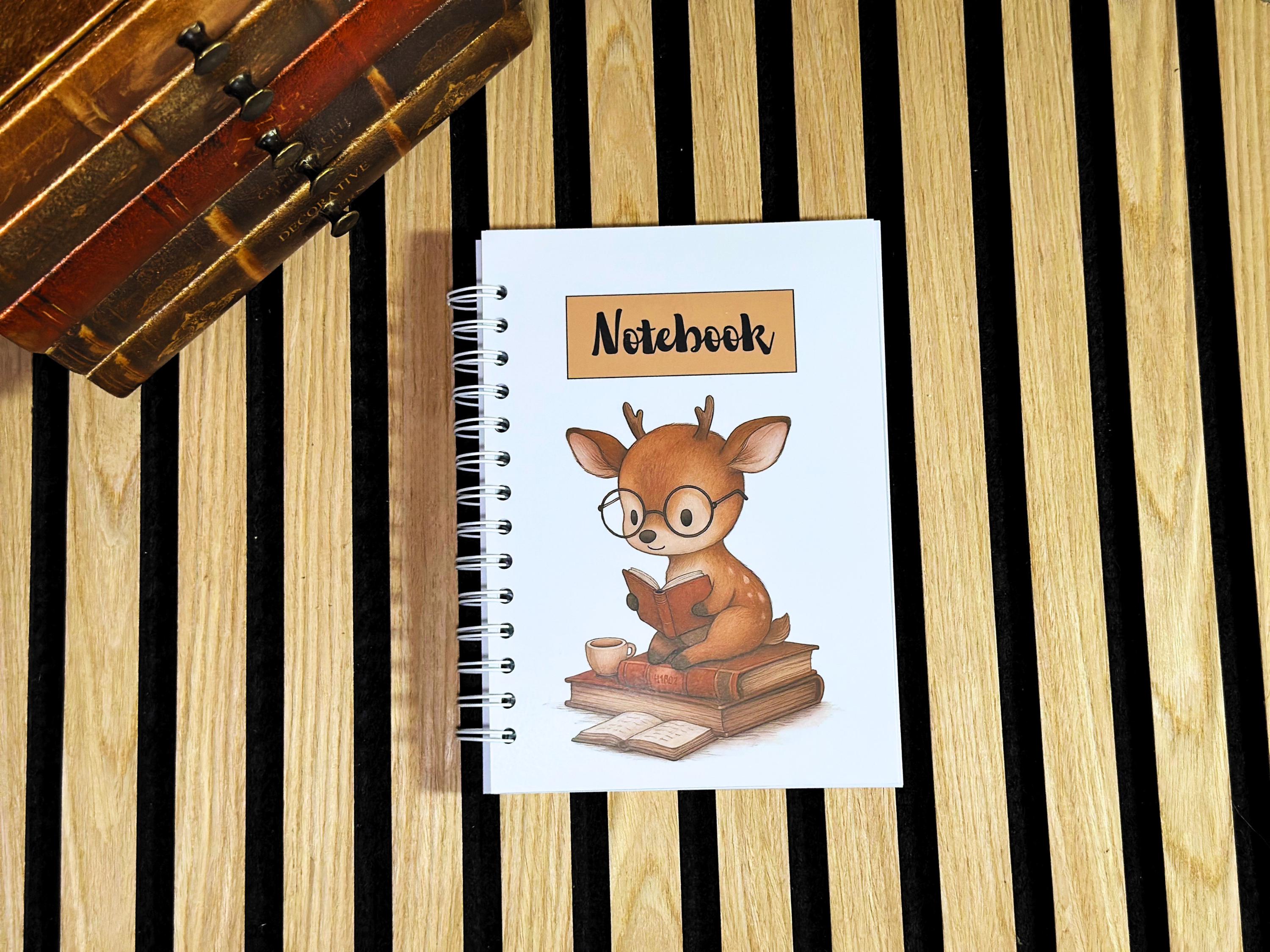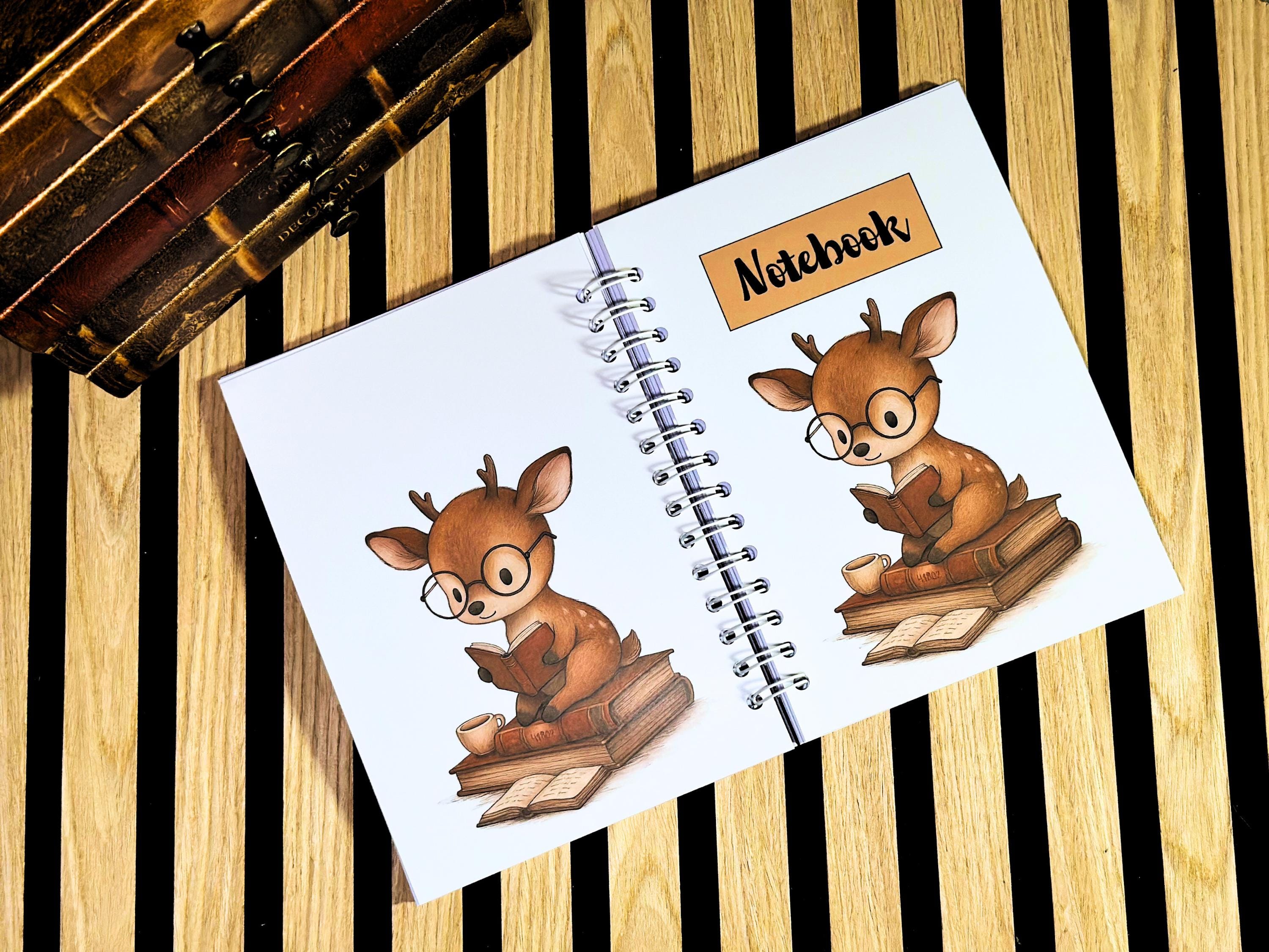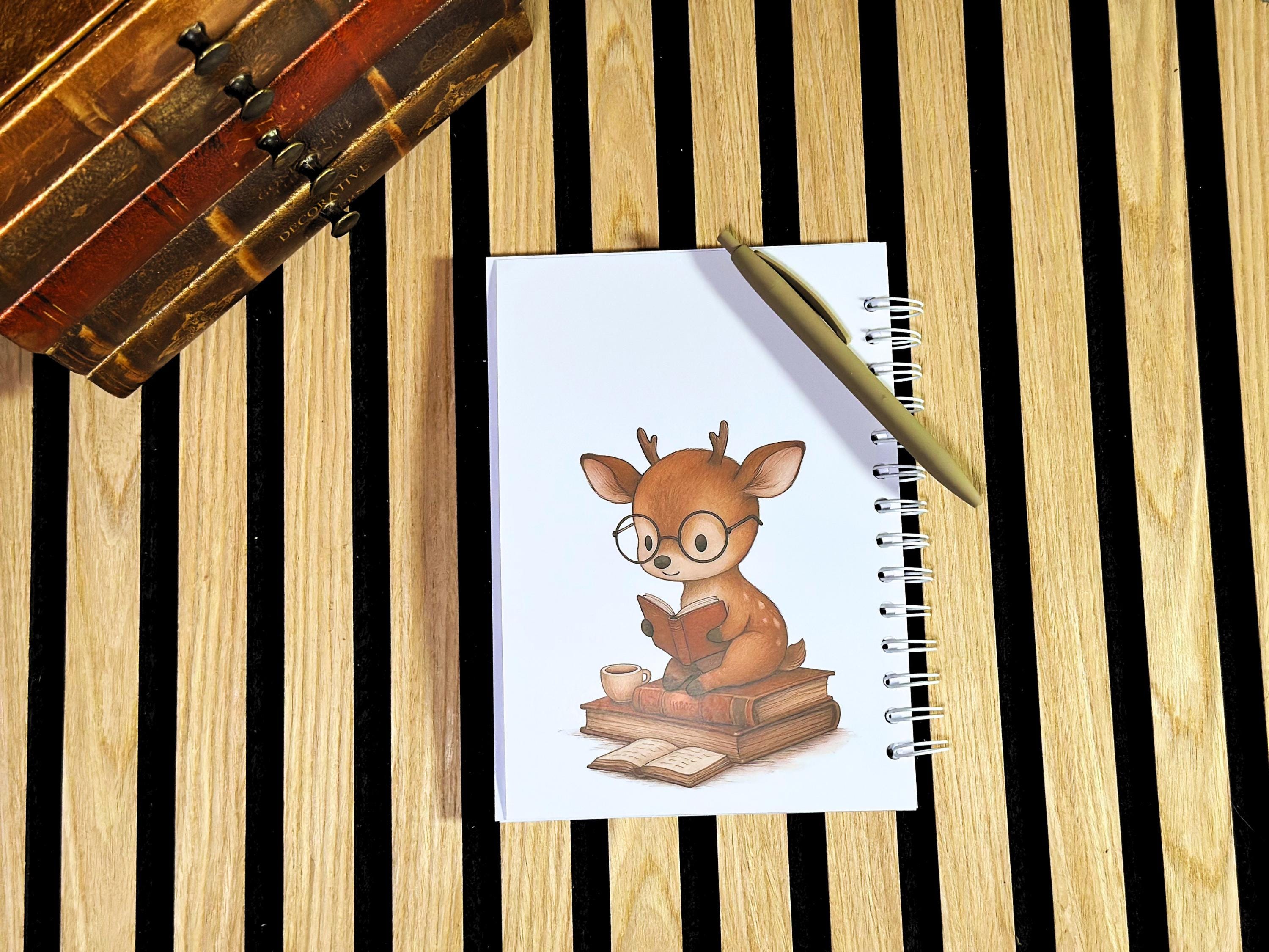 A sweet, inspiring notebook: a little fawn with glasses reads while sitting on a stack of books, with a mug by its side. Perfect for notes, study, and everyday journaling. The white metal spiral allows a 360° lay-flat opening, so you can write comfortably all the way to the last page.